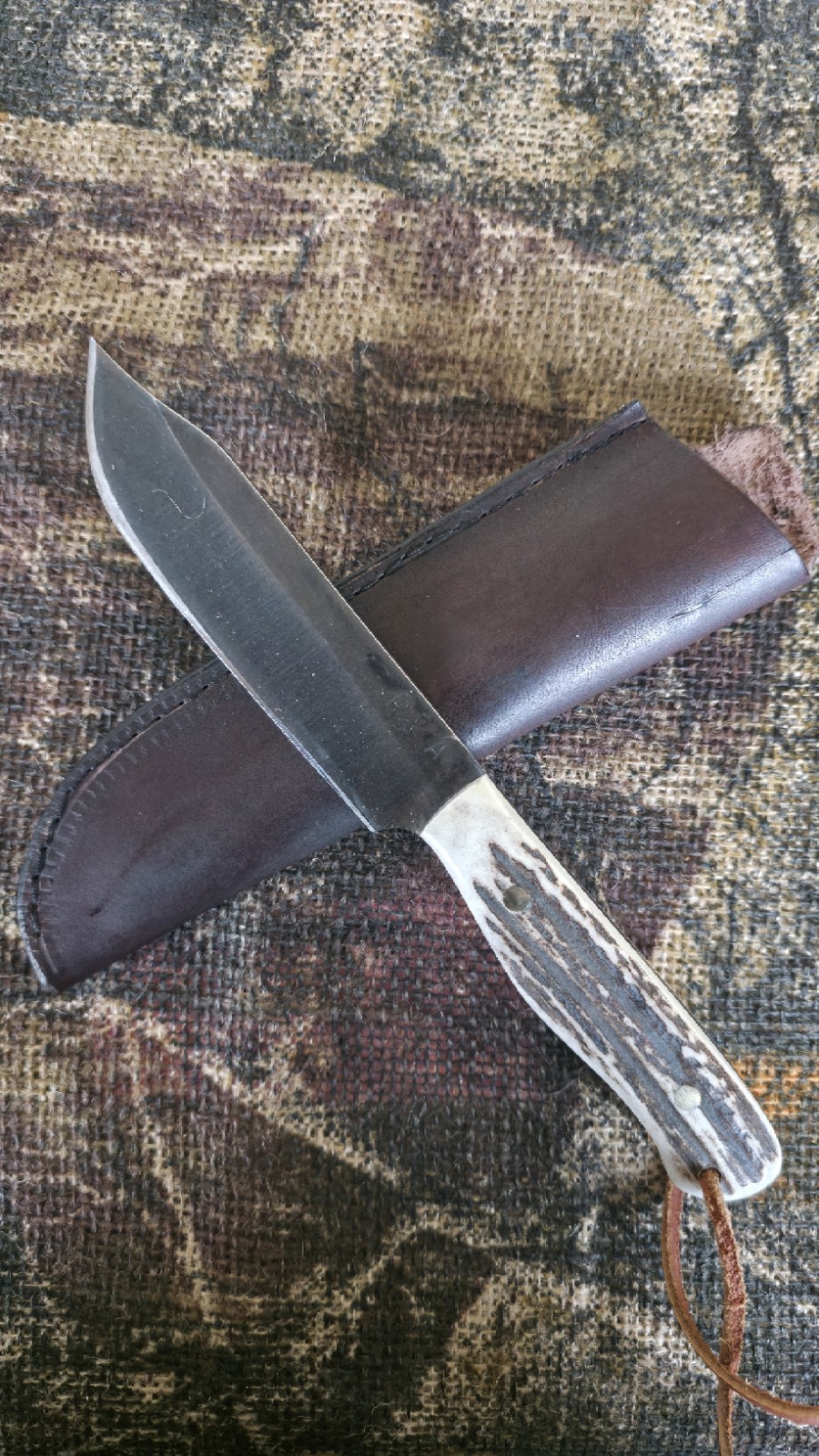 The R&A Custom Handmade Knife is a high-quality hunting knife made in the USA with carbon steel. It features a clip point blade with a plain edge and a full tang design for durability. The handle is made of elk horn, adding a touch of uniqueness to the piece. The knife comes with a sheath included, making it convenient for carrying and storage. As an original piece with handmade craftsmanship, this knife is a valuable addition to any collector's display.