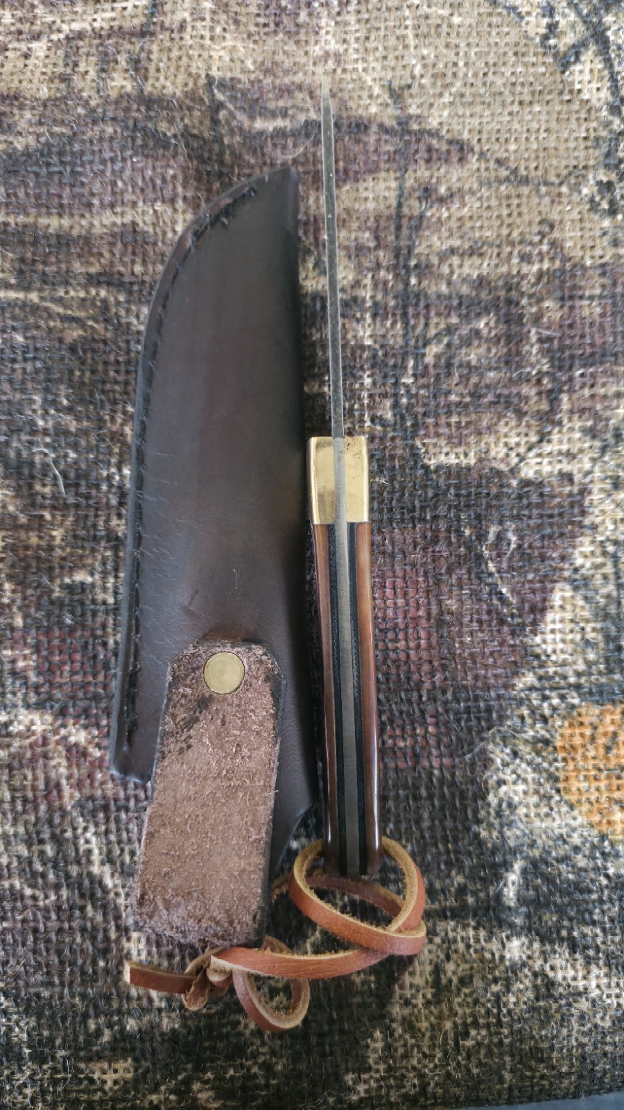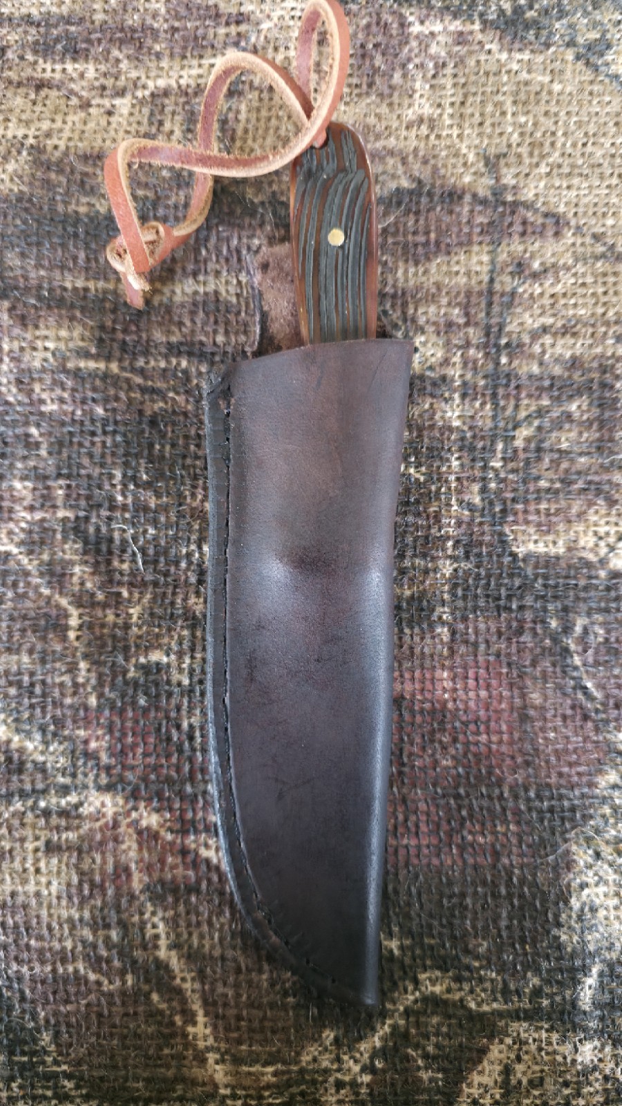 The R&A Custom Handmade Knife is a high-quality hunting and everyday carry knife made in the USA. The blade is crafted from durable 8670 carbon steel with a black color and a trailing point design, making it perfect for outdoor activities. The handle is made of camel bone, adding a unique touch to the knife. Other features include a lanyard hole, a sheath for safe storage, and a plain blade edge for easy maintenance. This original piece is a must-have for collectors and outdoor enthusiasts seeking a reliable and versatile tool.