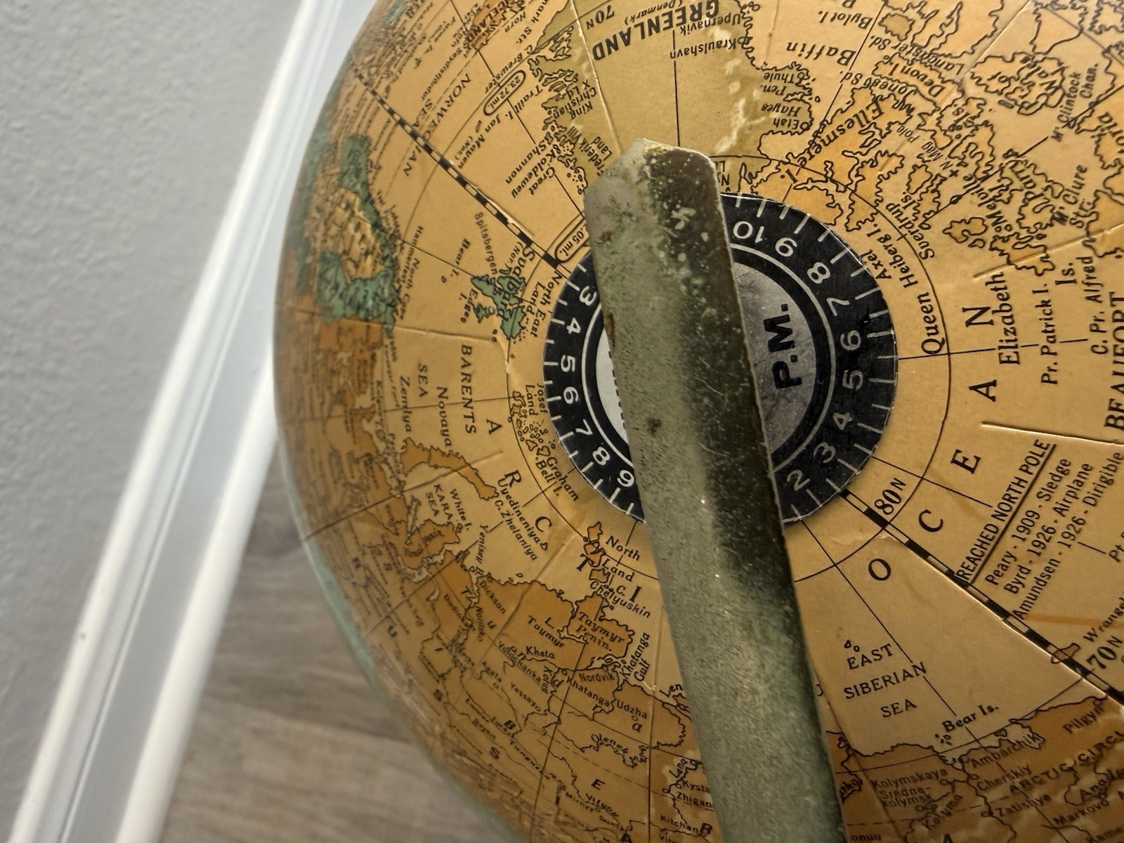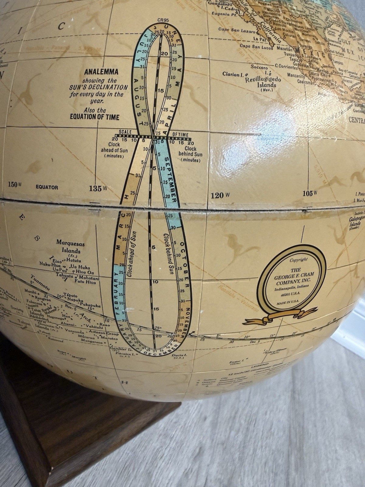 The Vge Cram's Imperial World Globe is a vintage piece with a 12" diameter and a bronze color, featuring intricate details of the world in its original format. Hinged and rotating, this globe was made in the USA during the USSR era, making it a unique collector's item that showcases the craftsmanship and cartography of its time. Perfect for history enthusiasts or those looking to add a touch of nostalgia to their decor, this world globe is a timeless piece that captures the essence of exploration and discovery.