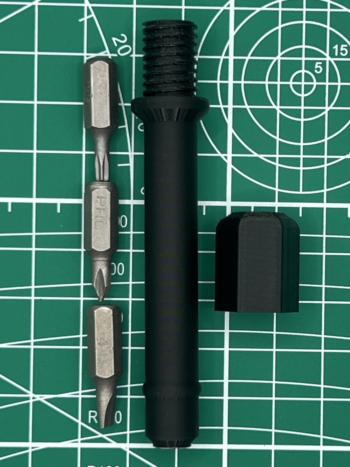 Holds up to three 1/4 inch hex bits. Inside of tube is hexagon shaped to keep bits secure and not rattle. Cap is threaded. Pictured being used on Leatherman Surge soft carry case. Will work in many other applications. NO BITS included