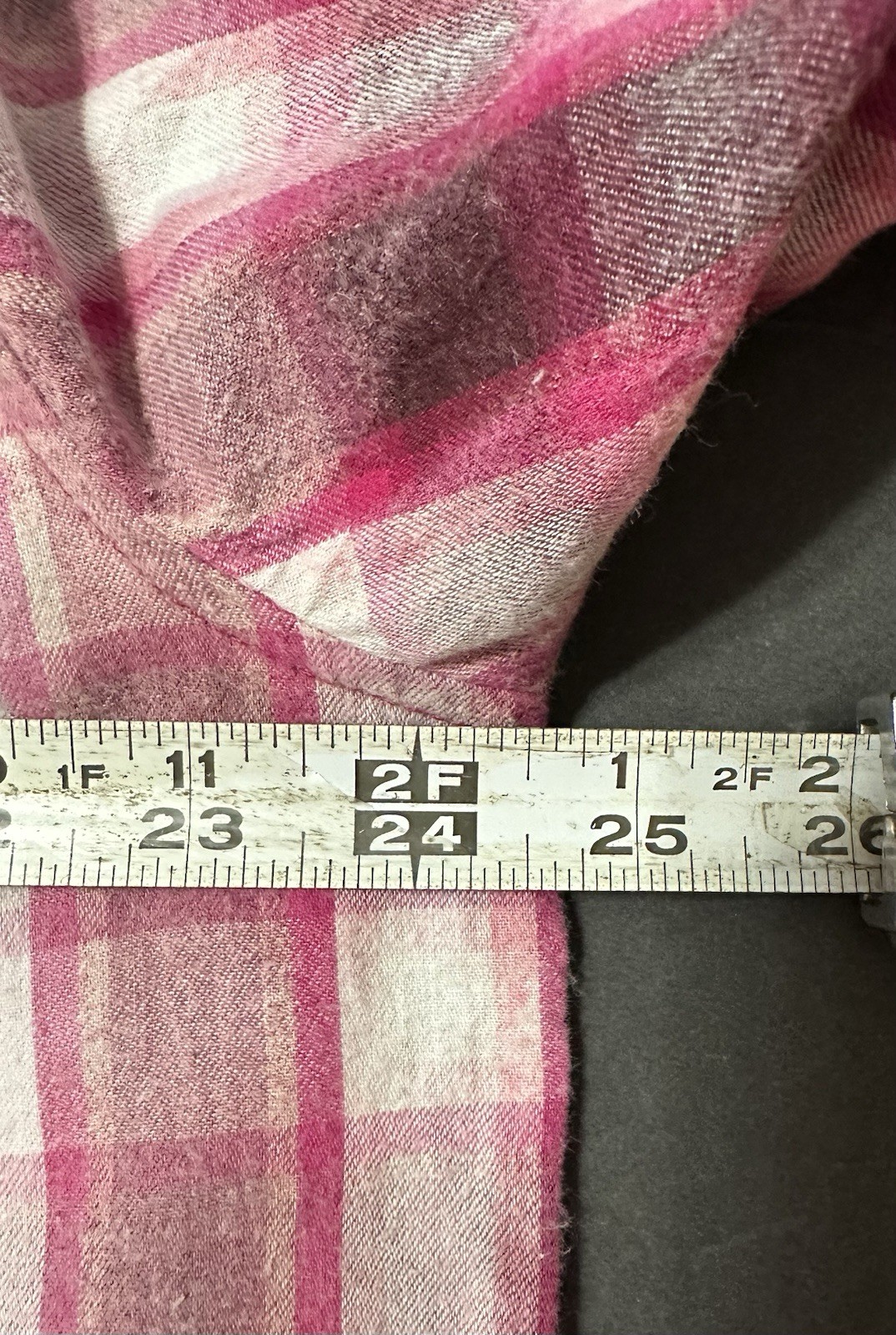Time & Tru Woven Pink Purple White Plaid Long Sleeve Plus Size Button up with "You Threw Dirt on My Name & Flowers Grew" graphic.