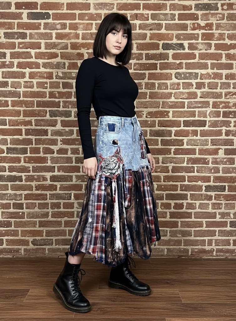 Upcycled Denim Jean Skirt Rose Reworked Patchwork Plaid Thrashed Punk Grunge M L