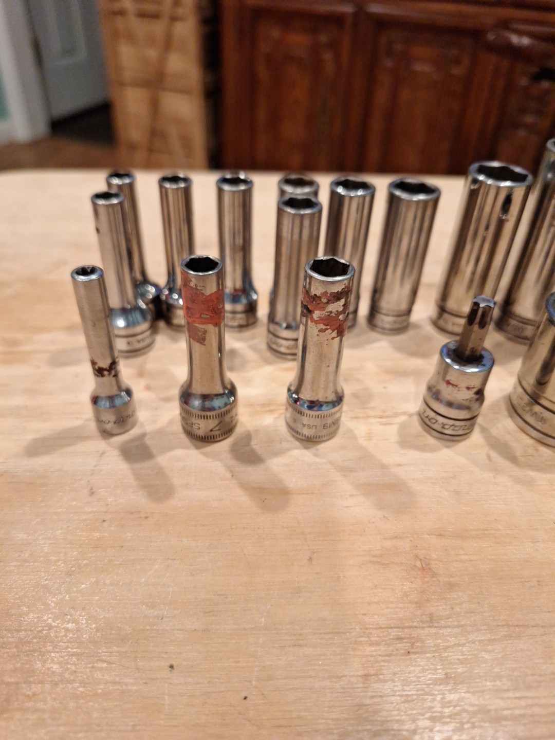 Snap on Socket assorted lot 2-1/4  5/16  11/32  2-3/8  7/16  1/2  5/8  13/16  short 15/16 9mm 7mm E5 and t40 torx