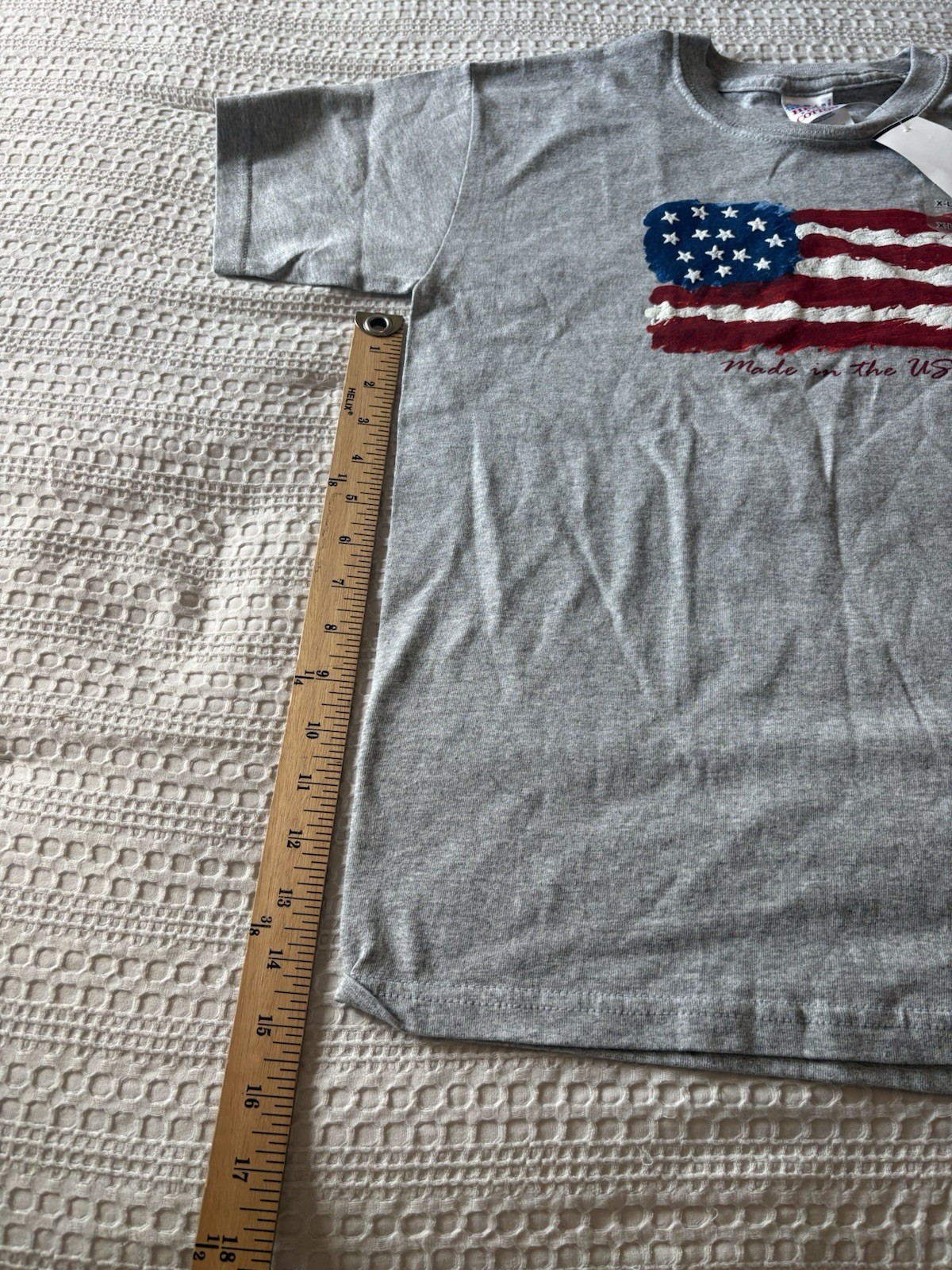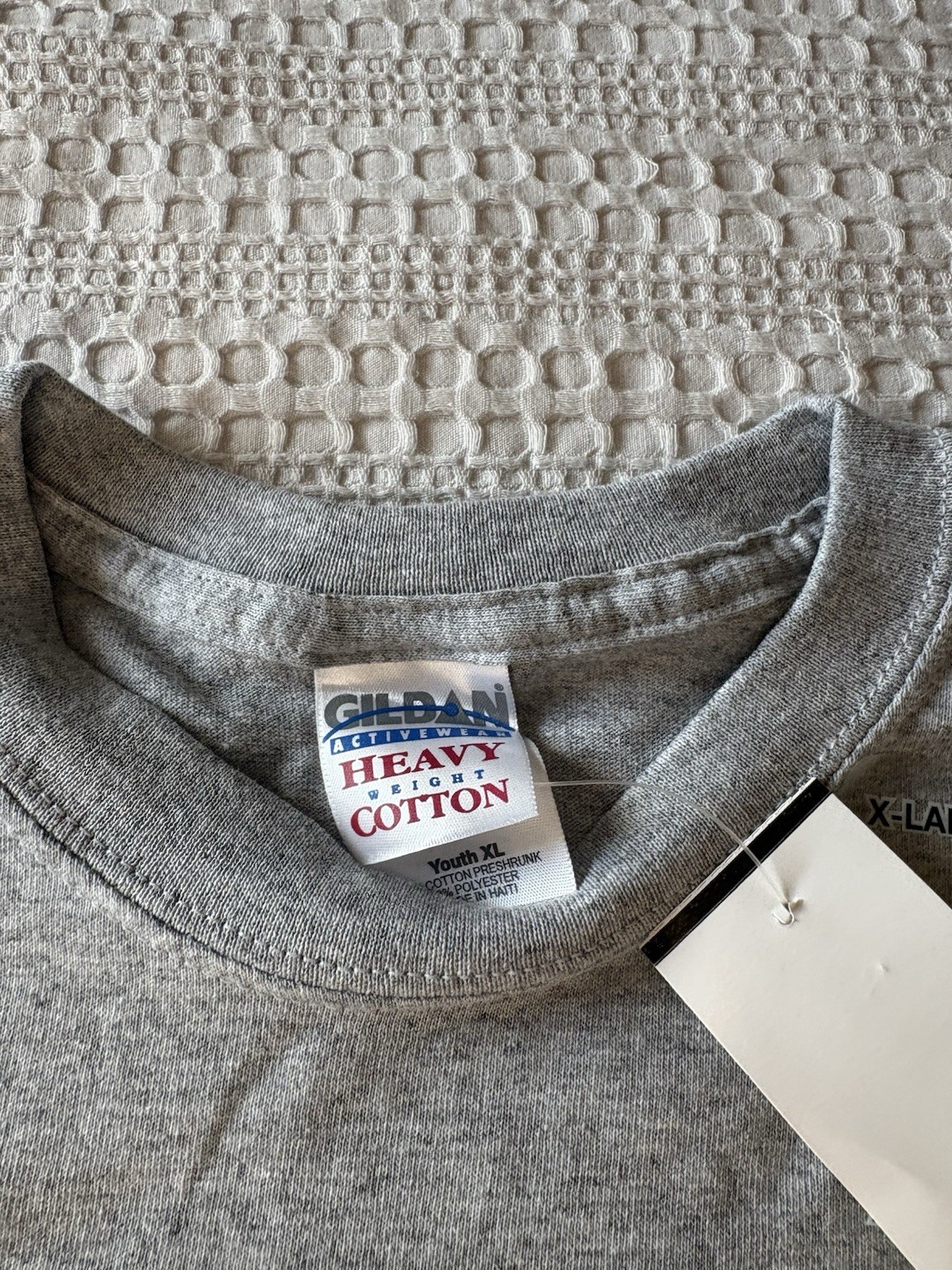 The product is a vintage Gildan T-shirt in size XL, made in the USA. This short sleeve shirt in gray color is perfect for teens and features a theme of the USA. It is a classic and durable piece that captures a sense of nostalgia and patriotic style.