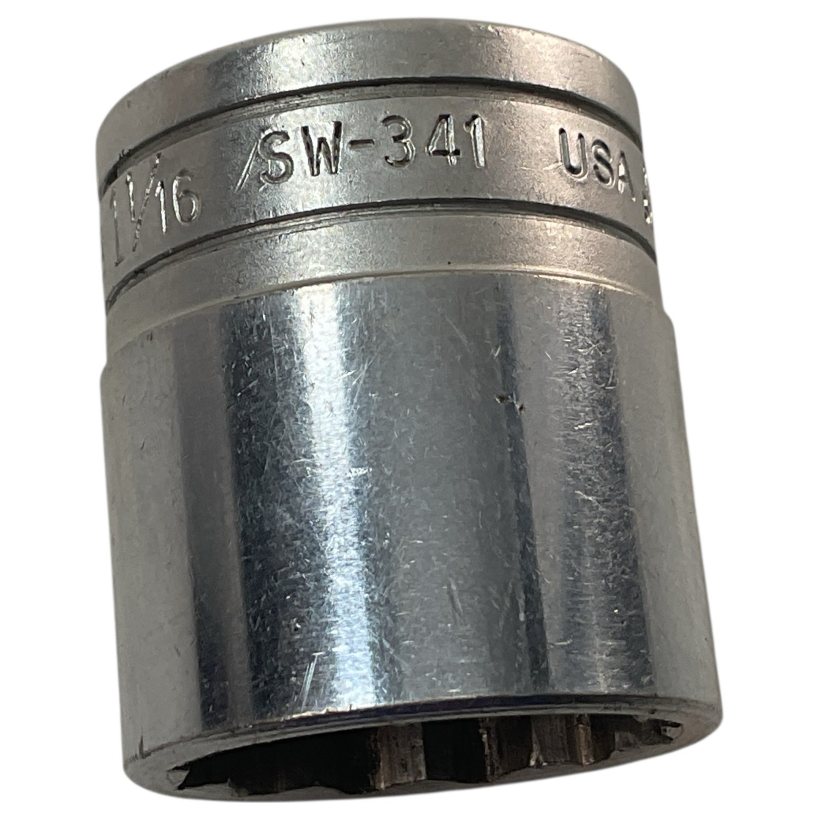 This Snap-On SW341 standard socket features a 1-1/16" SAE size with a 1/2" drive and 12-point design for reliable fastener engagement. Built for durability and precision in automotive and mechanical applications. Manufactured in the USA and designed for long service life.