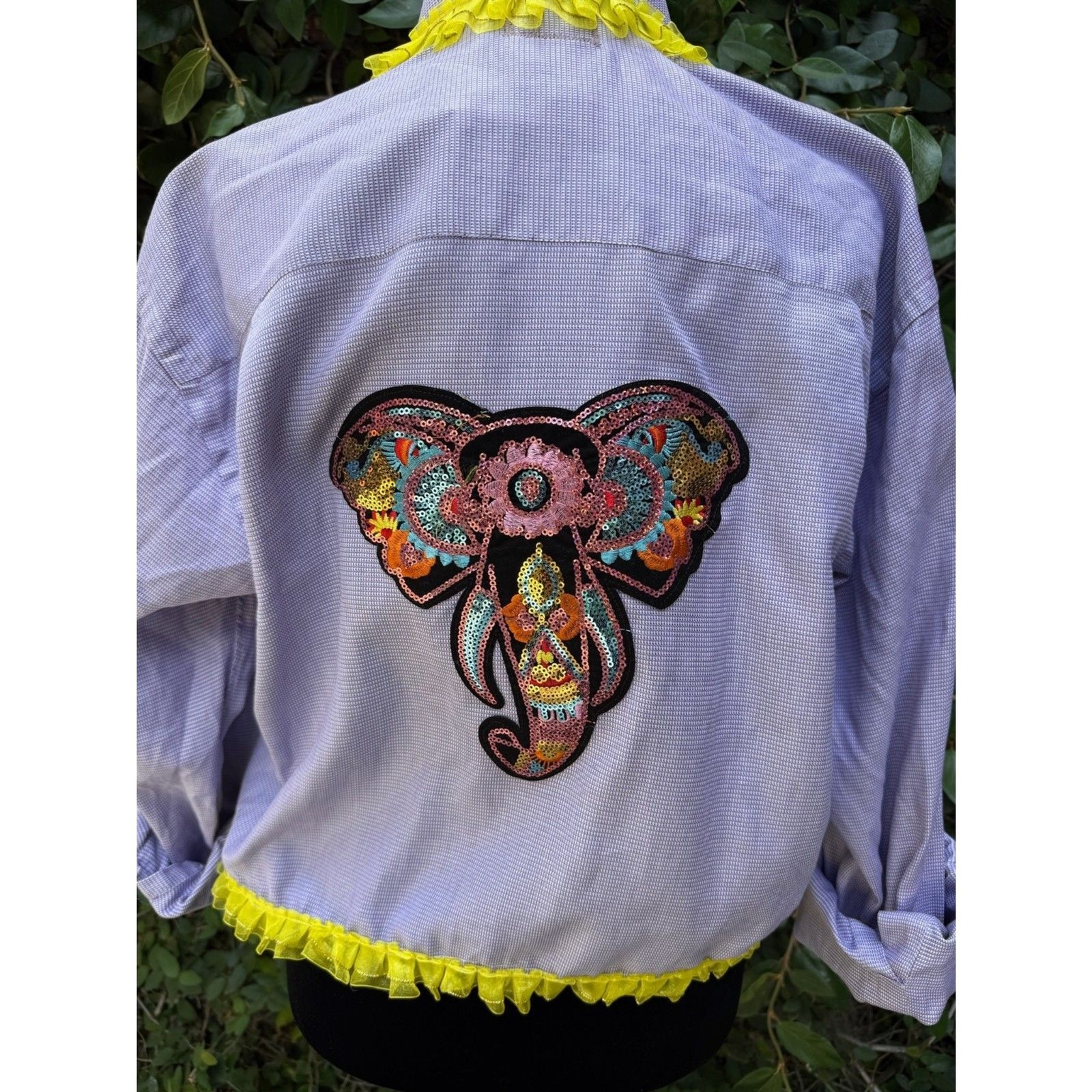 Bespoke one of a kind upcycled creation by Dead Lady Vintage. Upcycled purple woven cropped mens dress shirt. Embellished with sequin elephant patch, yellow ruffle and floral trim. Size L/15/34. Pit to pit 21"; length 18.5" to hem.