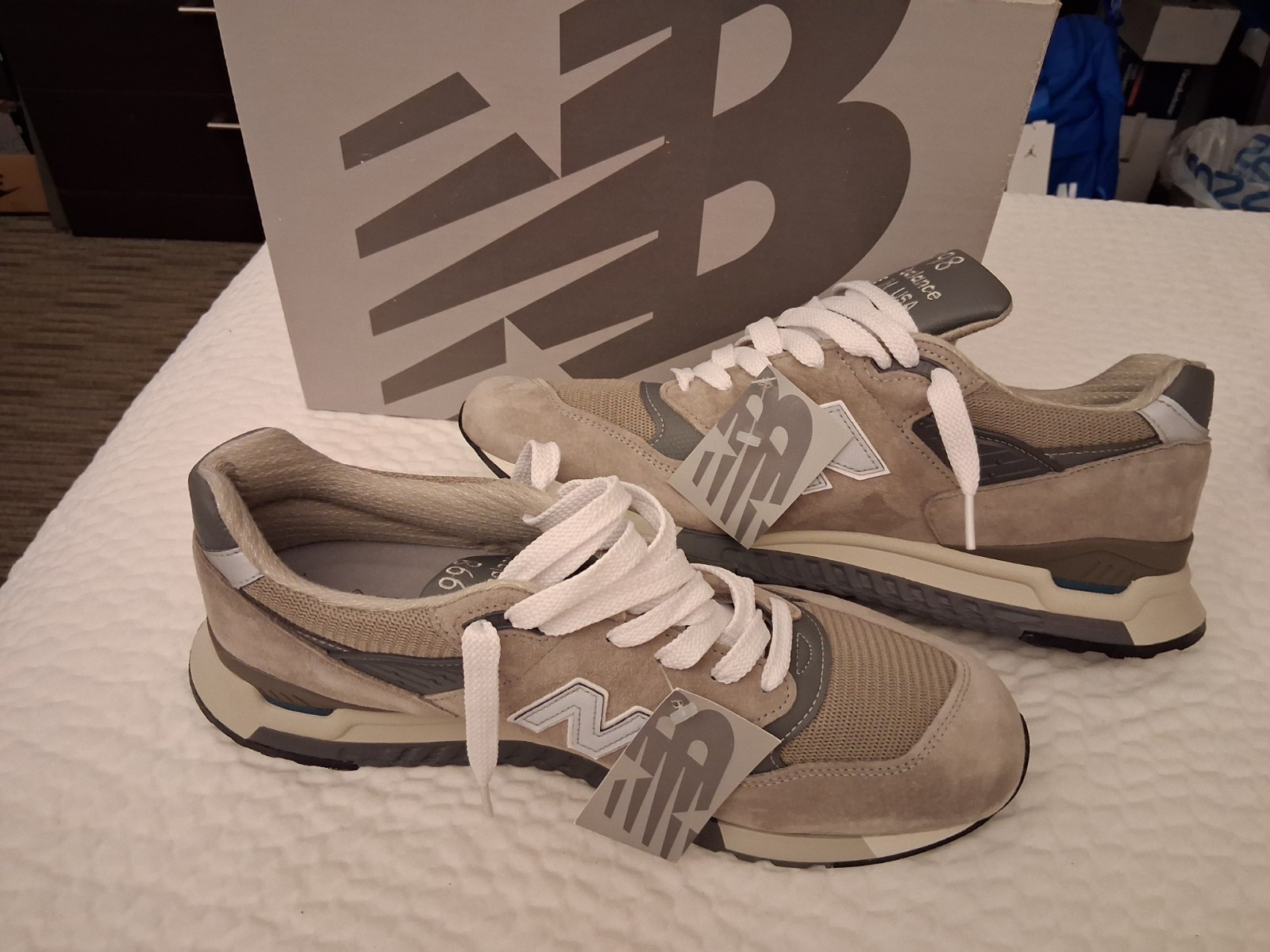 The product is a new pair of New Balance 998 sneakers in a stylish grey color, made in the USA specifically for men in size 13. This athletic shoe features the iconic NB 998 model, perfect for casual wear or sports activities. With its quality craftsmanship and classic design, these sneakers are a great addition to any man's shoe collection.