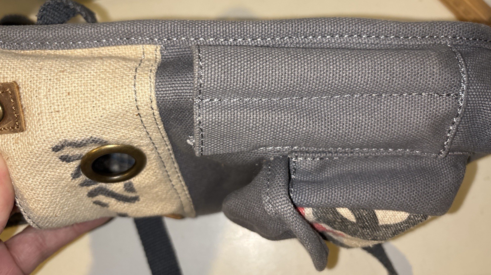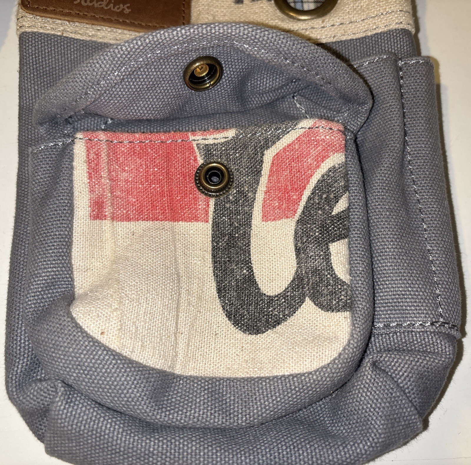 Super cute and sturdy Selina Vaughan Studios (now Magpie Tiger) Canvas Small Crossbody Bag using Up cycled Seed Sacks and canvas in cornflower gray blue, with brown, blue and beige plaid interior. It’s convertible: crossbody or Fanny pack that will attach to belt. Her designs are “Vintage Americana reimagined: One-of-a-kind handbags, apparel, and accessories crafted from original seed sacks and cherished quilts. Handmade with heart in Florida.” - from FB page. See photos for details and measurements.