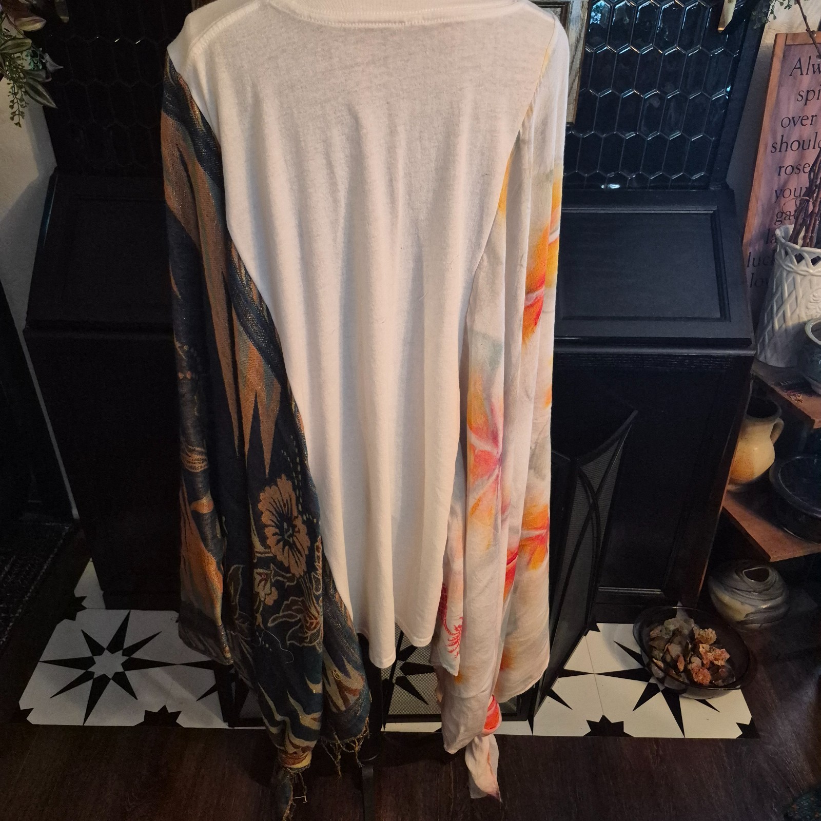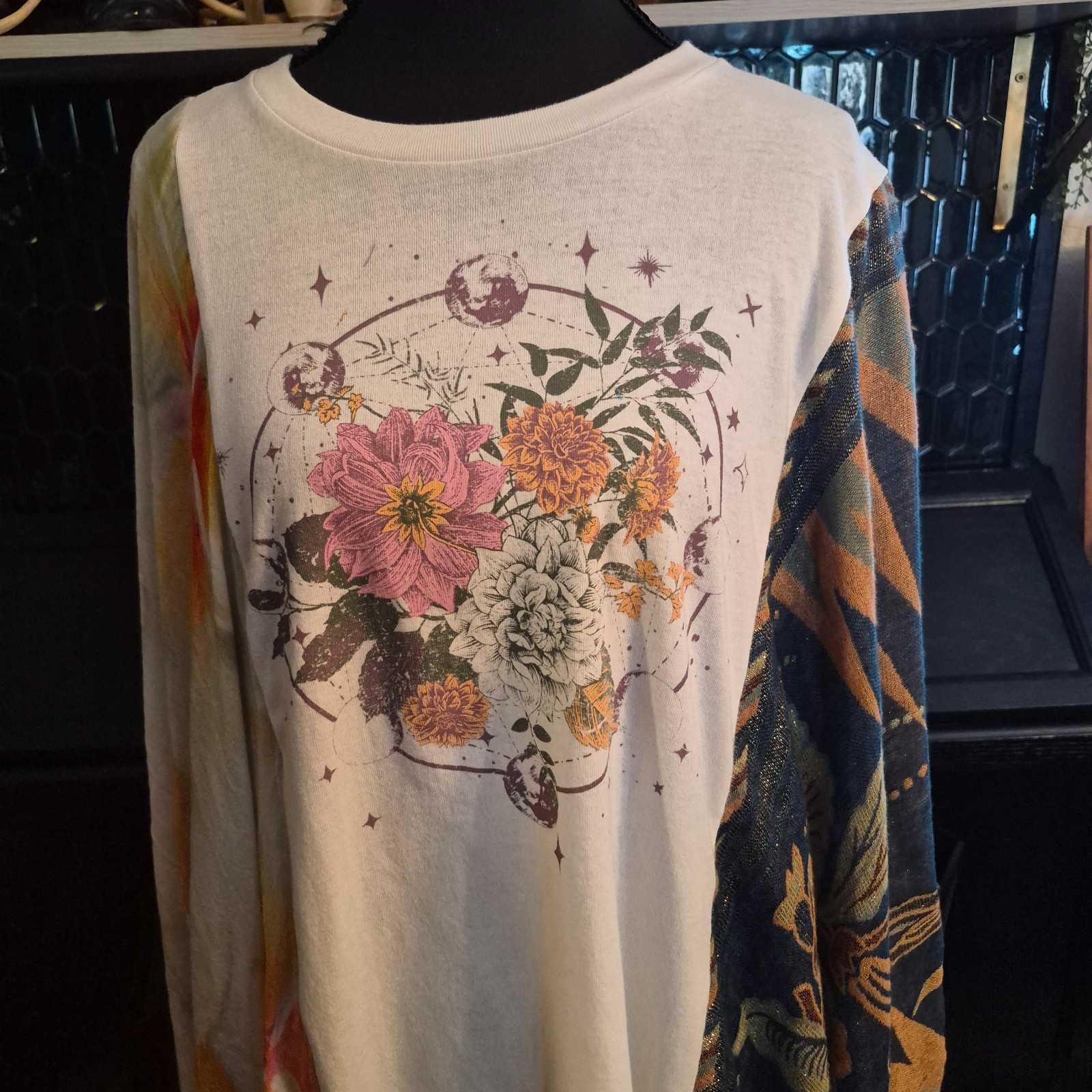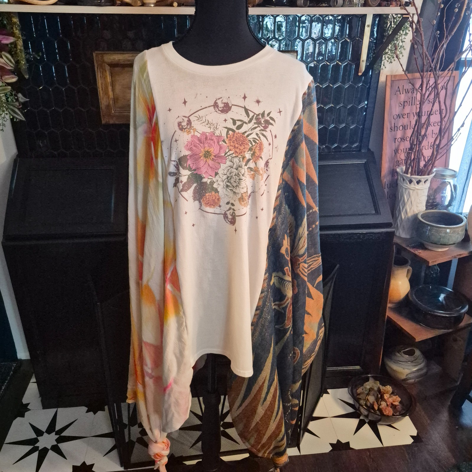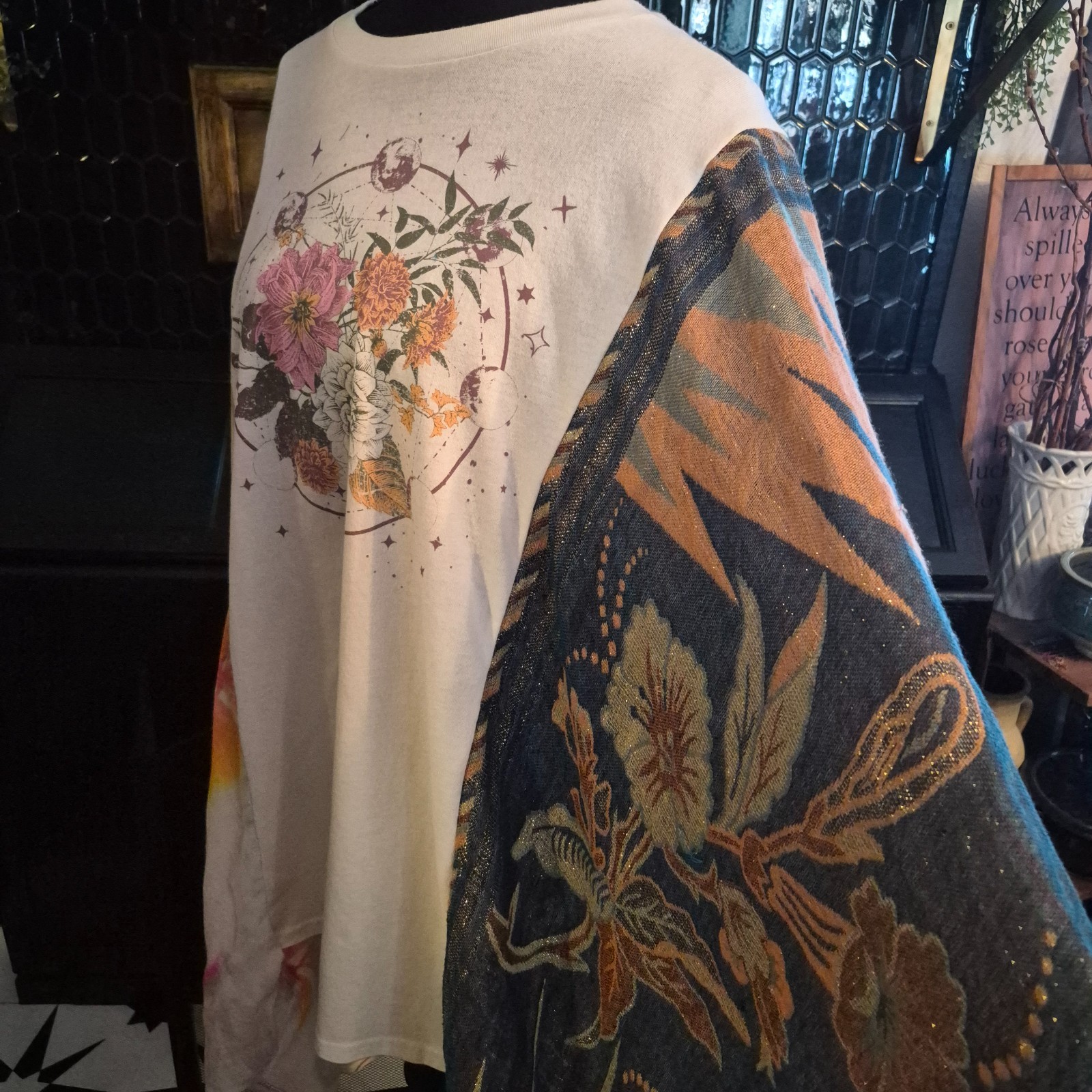 Upcycled Moon and Floral T Shirt Open Poncho True Free Size thru 4xl Boho OAK