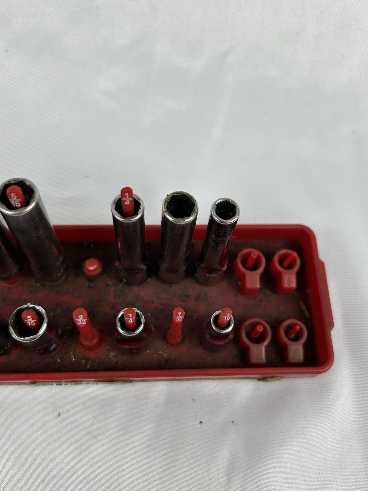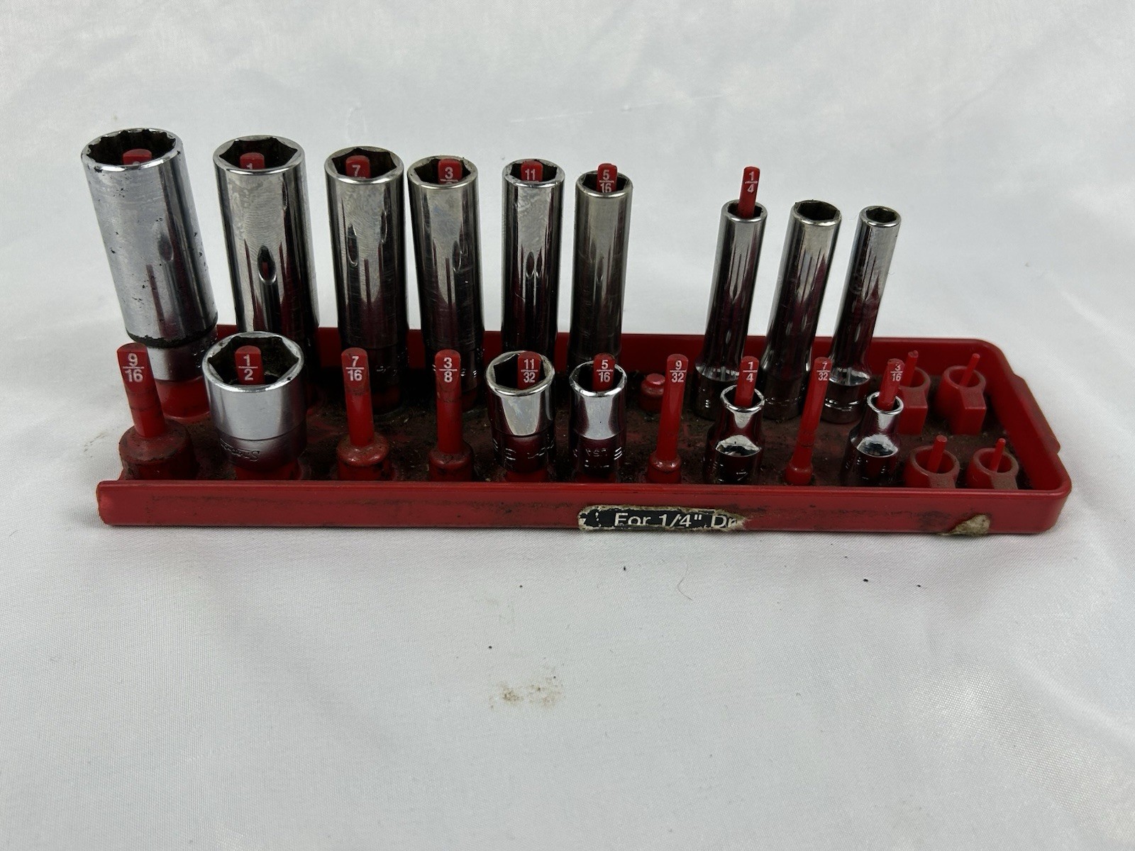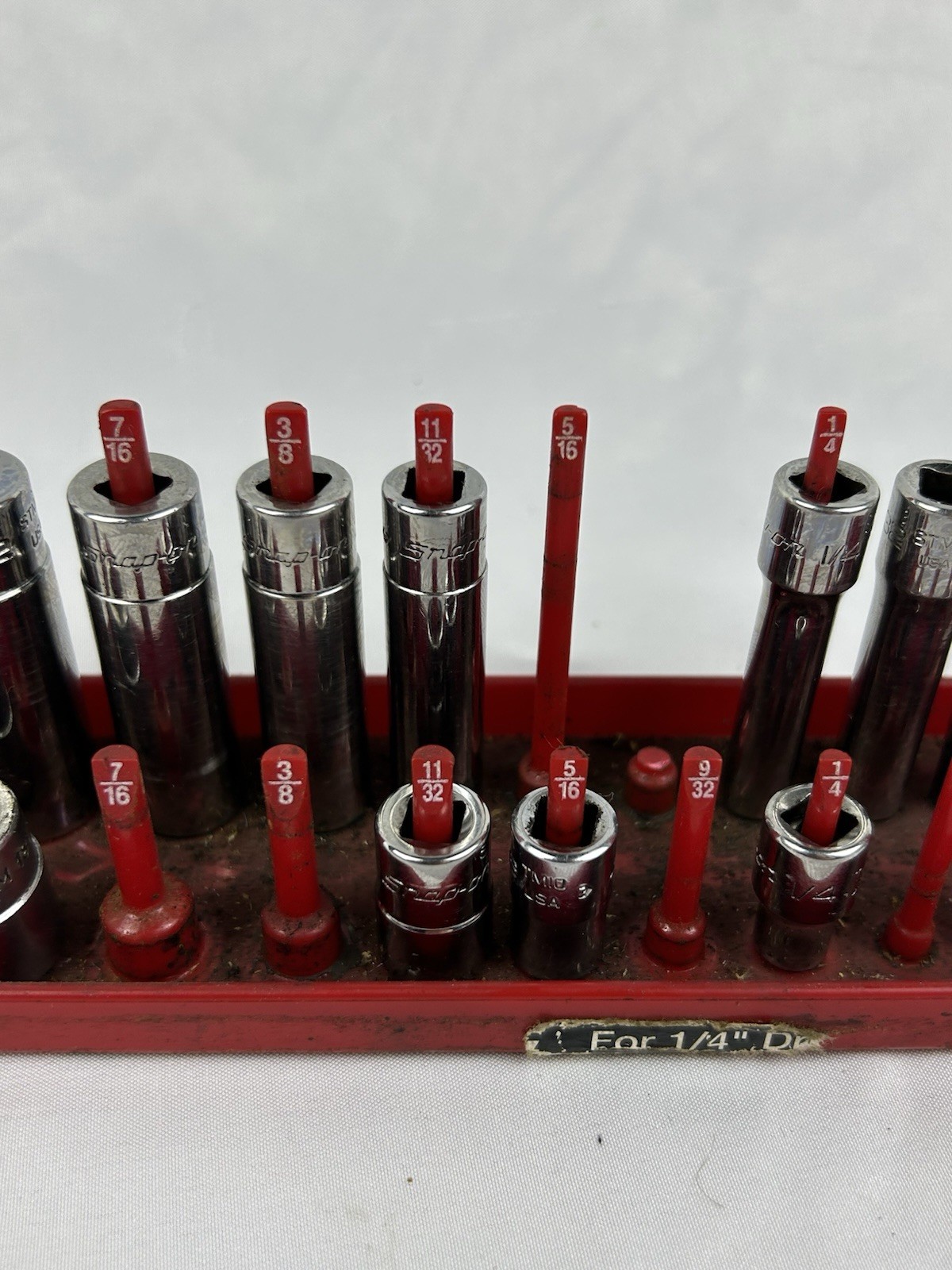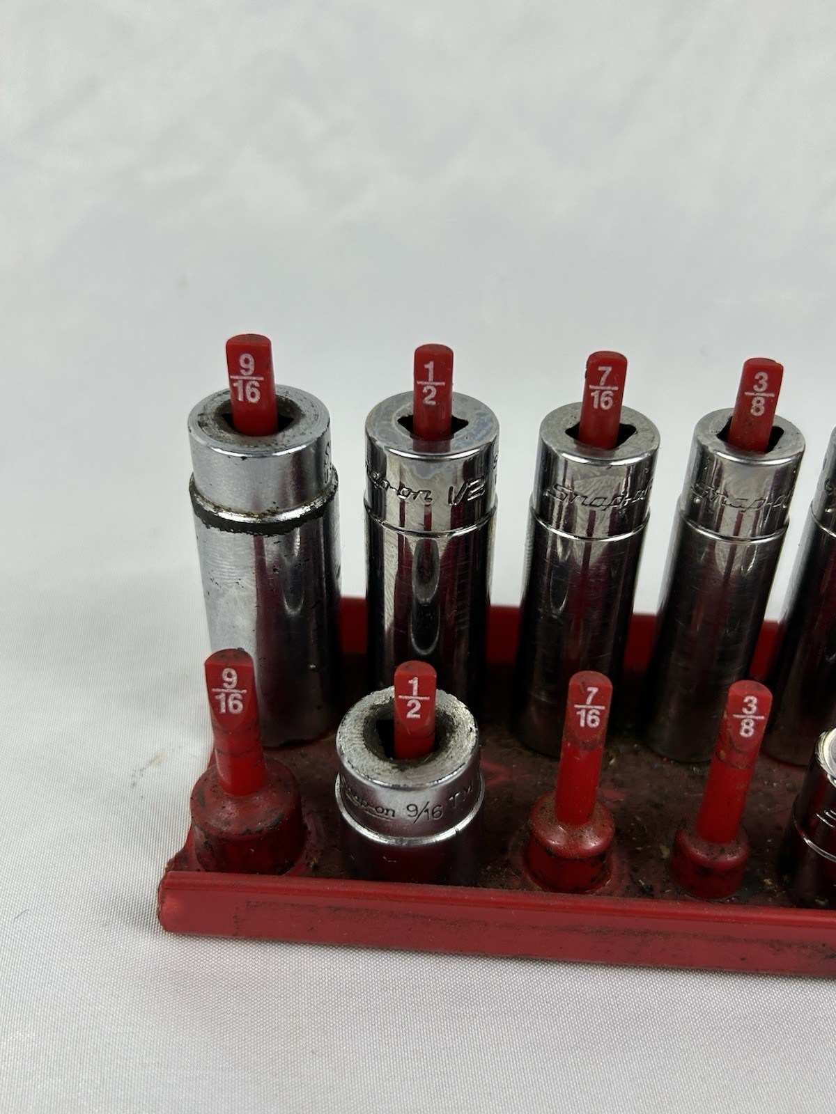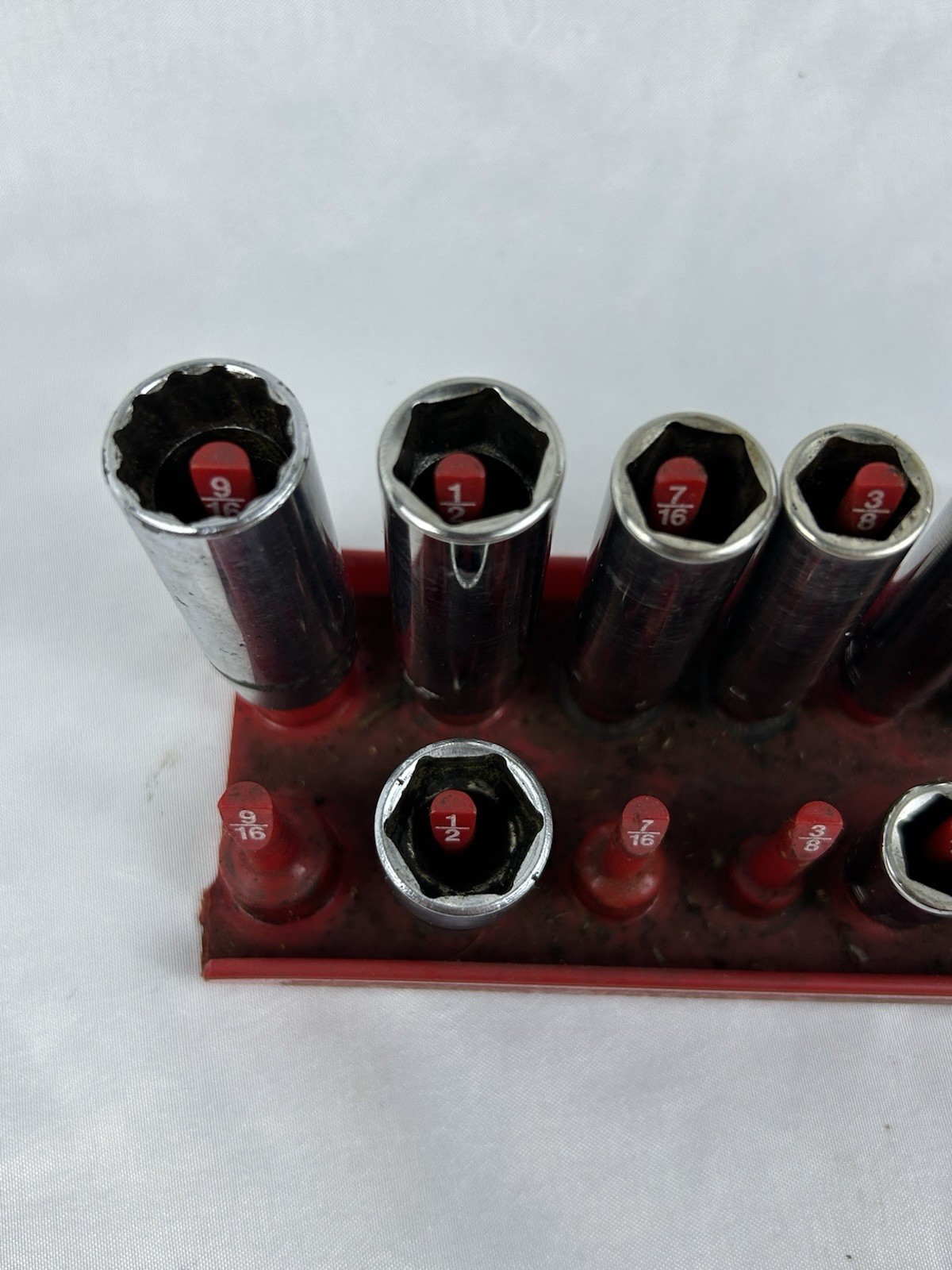The socket set is in good used shape and shows some scratches and blemishes due to wear and tear. The socket rail IS NOT included in the sale and used for just display purposes only. Please look over all the pictures prior to purchasing as the item in the pictures is what you be receiving.