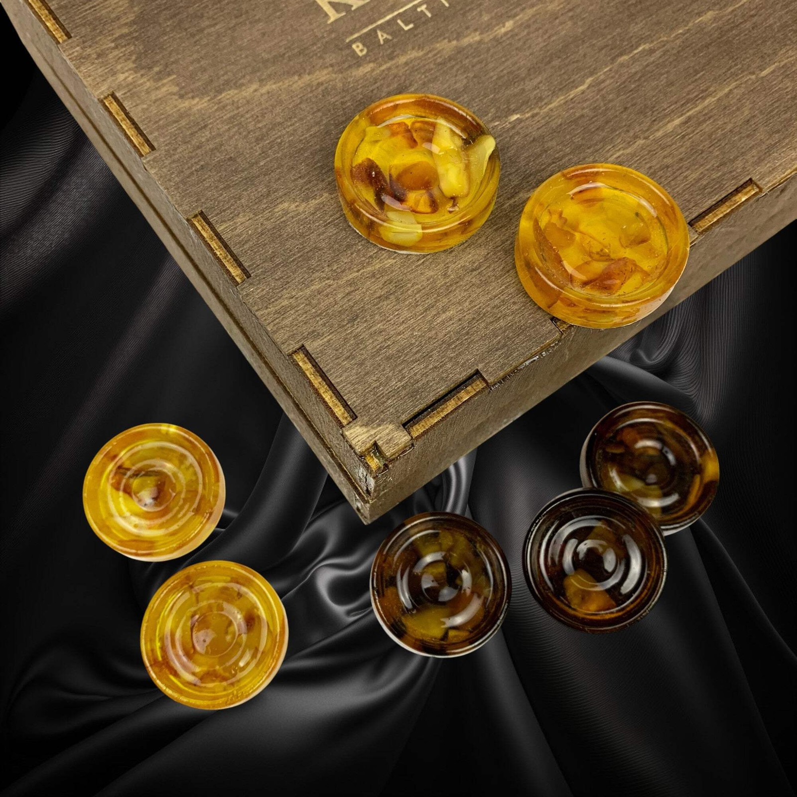 Experience the beauty and craftsmanship of genuine Baltic amber in this luxury 30 mm checkers and backgammon piece set. Each piece is handmade in our KIZIMA USA studio in New York, where we cast, shape, and polish every item individually to achieve a flawless smooth finish and deep natural glow.