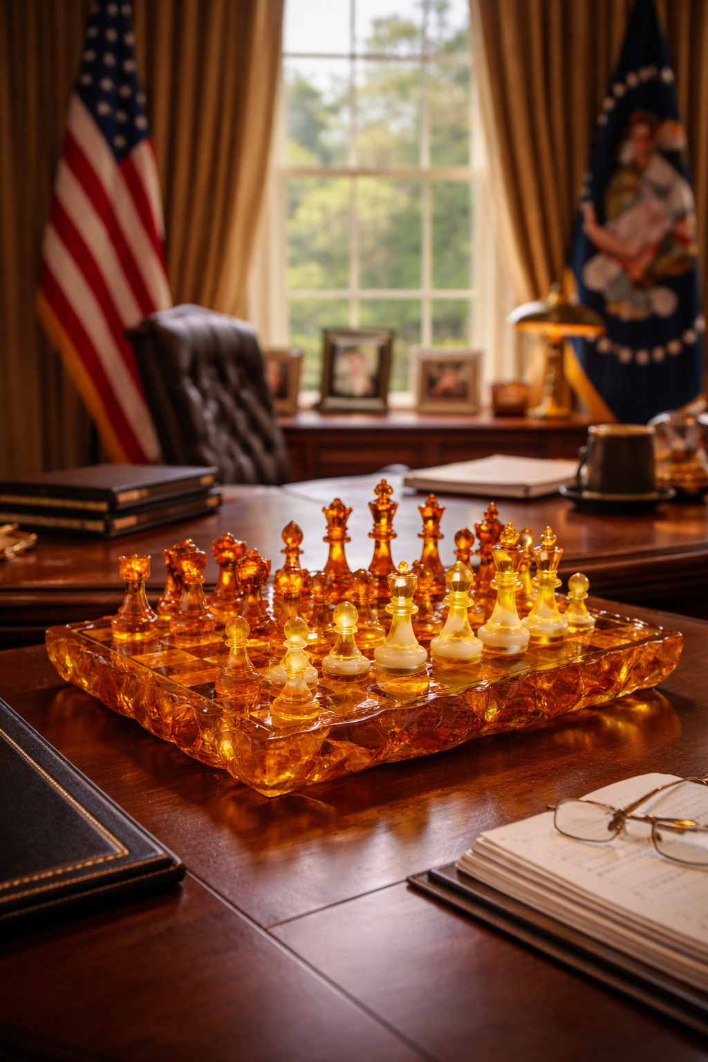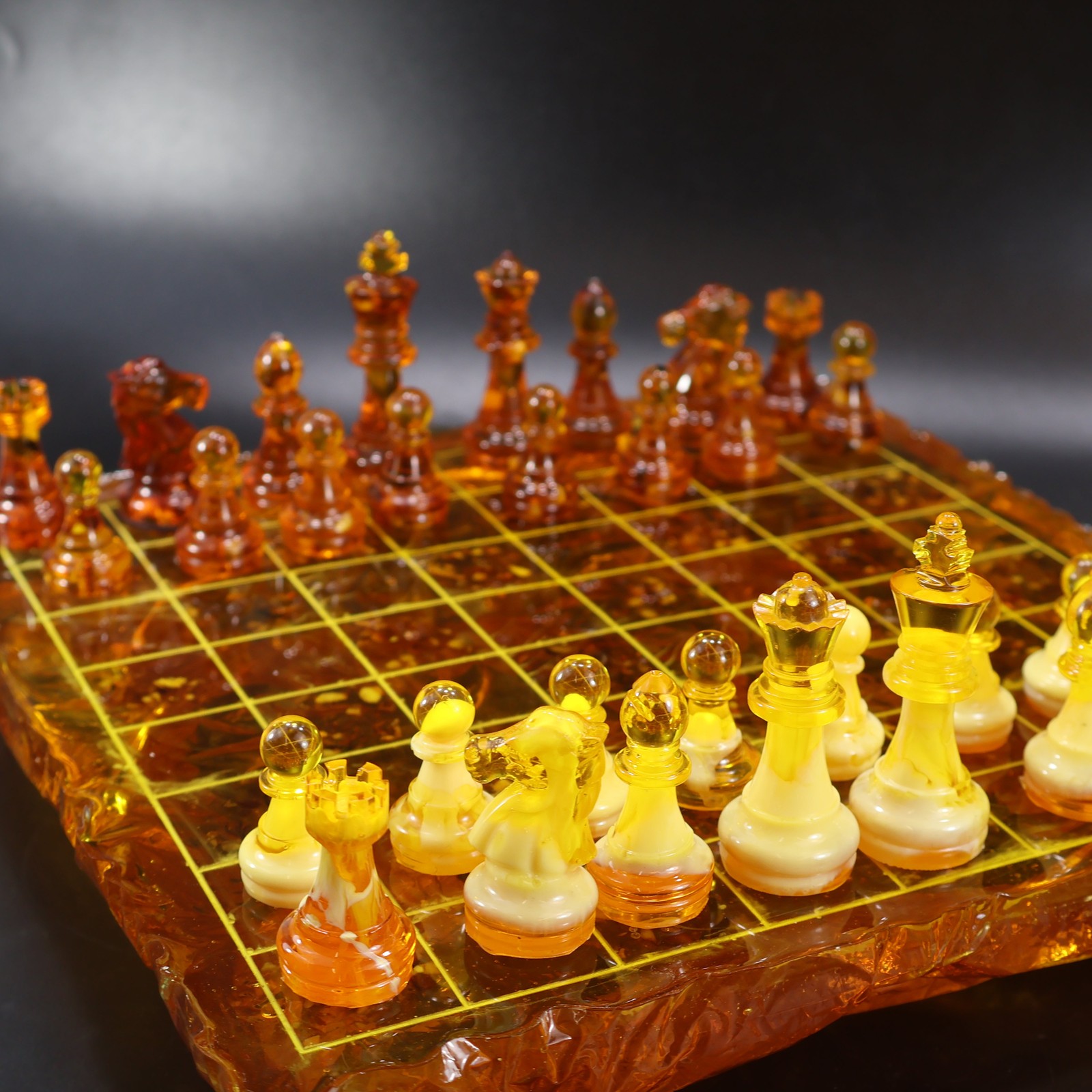 Luxury handcrafted amber chess set made in New York. A collectible statement piece for executive interiors and premium gifting.