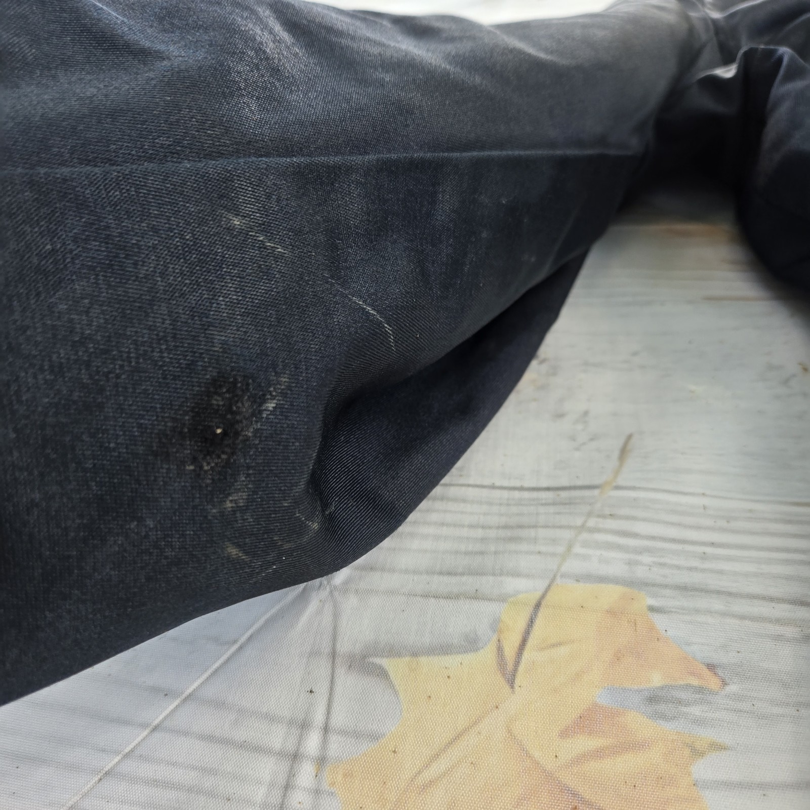 Just a stain on the right back hand part. Overall it's in very nice condition! Perfect for industrial/construction jacket.
