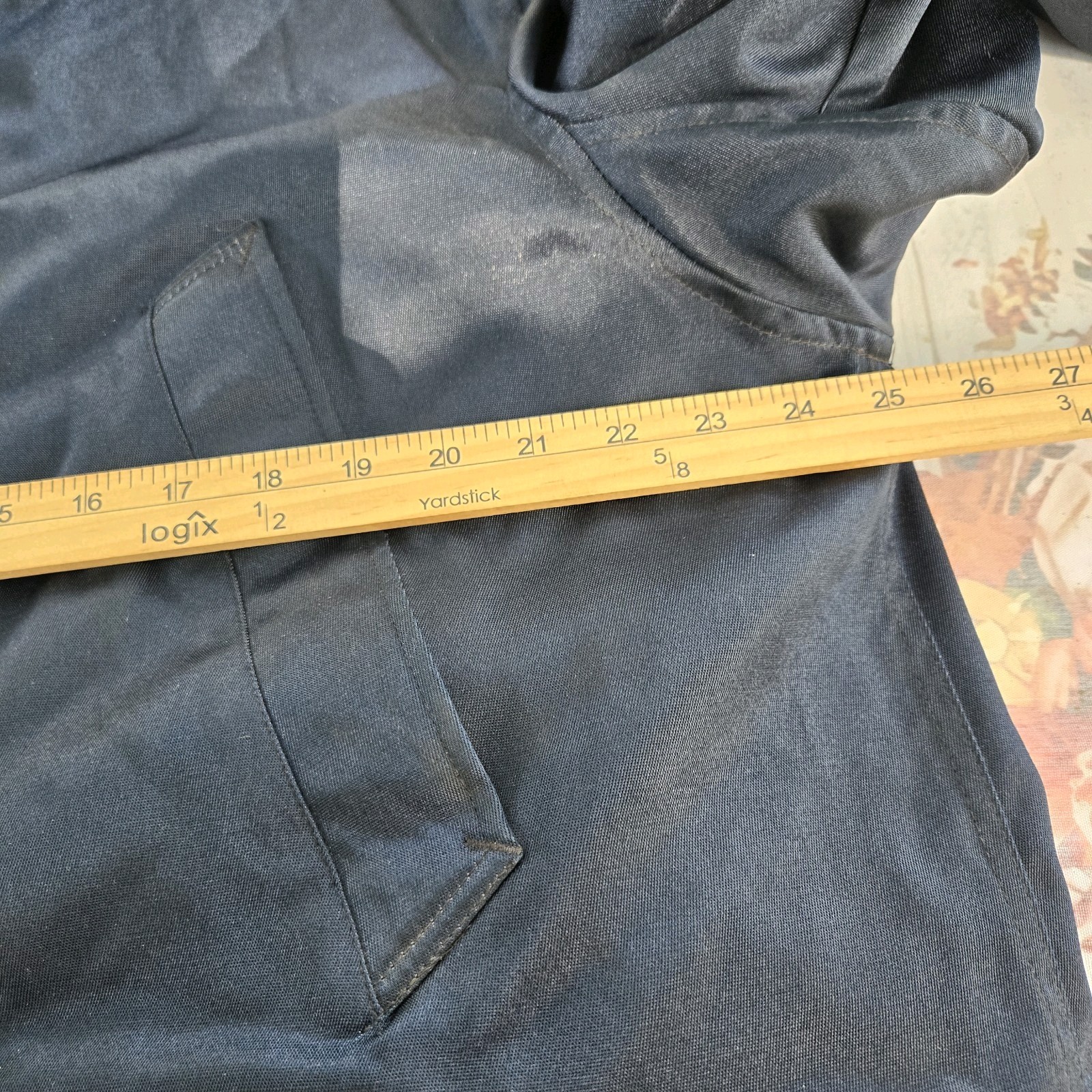 This Vintage Made In USA Golden Fleece Industrial Outerwear Size 46 Quilted Jacket is a classic piece of men's clothing, perfect for casual or workwear occasions. The jacket features a zip closure, lined interior, convertible collar, and stand collar. Made from durable Titan Cloth with a solid blue color, this jacket also includes elastic cuffs, waist cinch, and pockets for added functionality. With a touch of nostalgia and a hint of Americana, this vintage piece is a timeless addition to any wardrobe, suitable for various activities such as hunting, hiking, or just being seen.