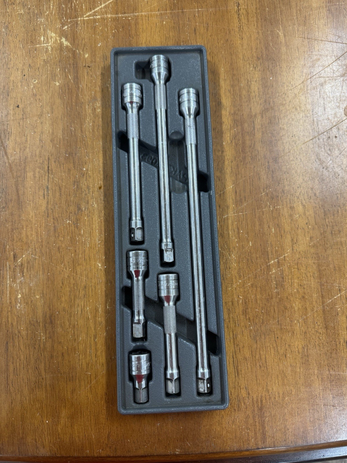 The Snap-On 6-Piece 3/8" Drive Extension Set is a high-quality hand tool set designed for automotive use. Made by Snap-on, a reputable brand known for their durable and reliable tools, this set includes six standard 3/8" drive extensions with a specialty drive type. The chrome surface finish not only looks sleek but also provides added durability and protection against corrosion. This set is perfect for mechanic professionals looking to expand their socket collection with a trusted brand like Snap-on.