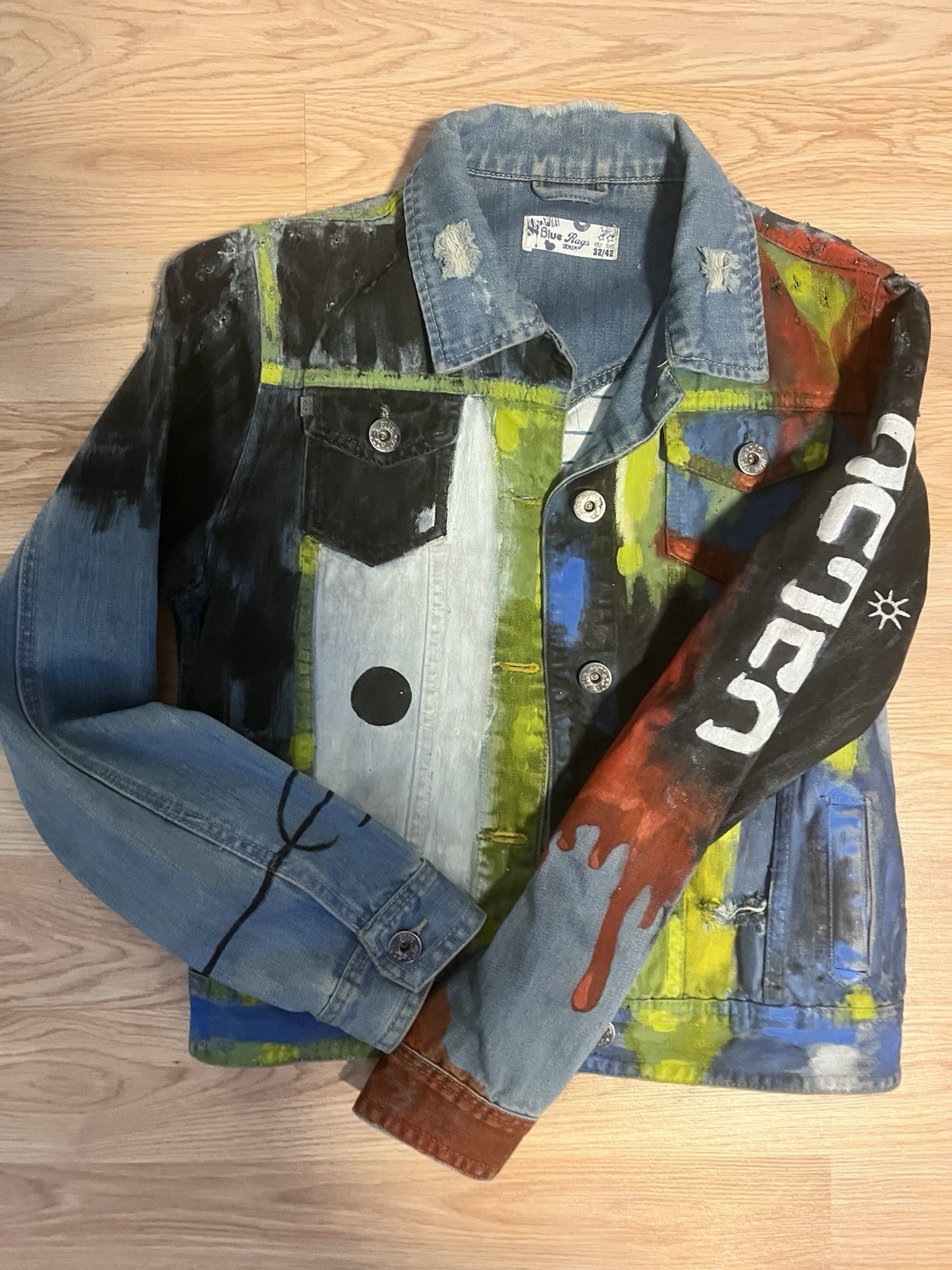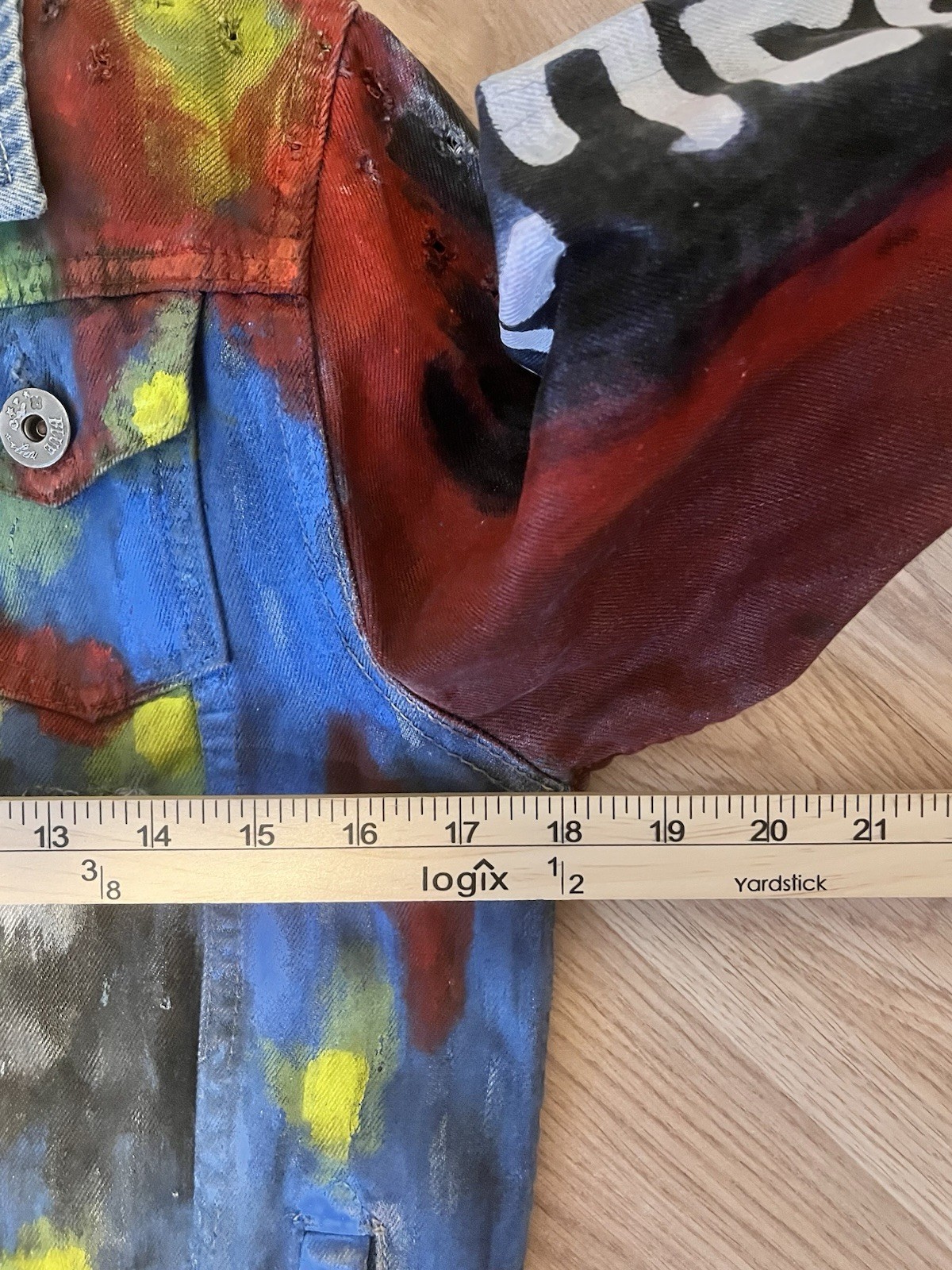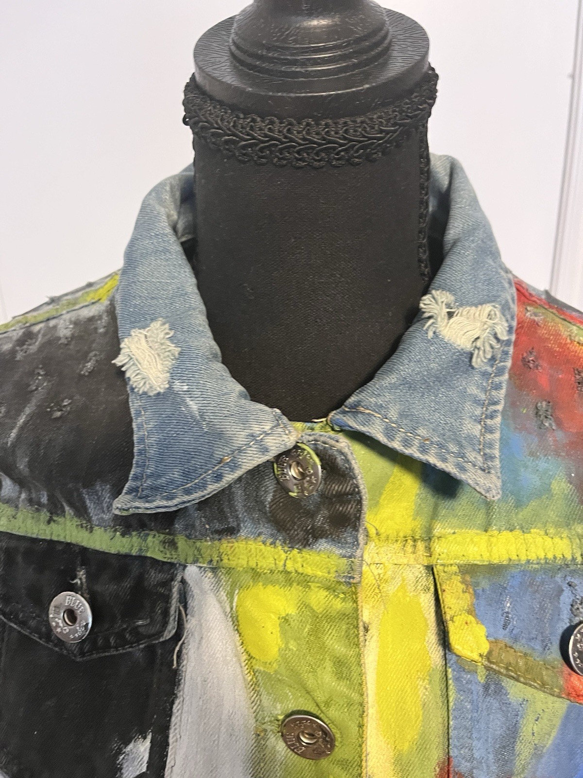 Denim Upcycled Jean Jacket is a small. Hand-painted and thrashed to give it a grunge look, this jacket is perfect for a casual occasion with its hip hop-inspired design. Made from denim material and originating from Sri Lanka, this Multi-Color jacket adds a touch of individuality to any outfit.