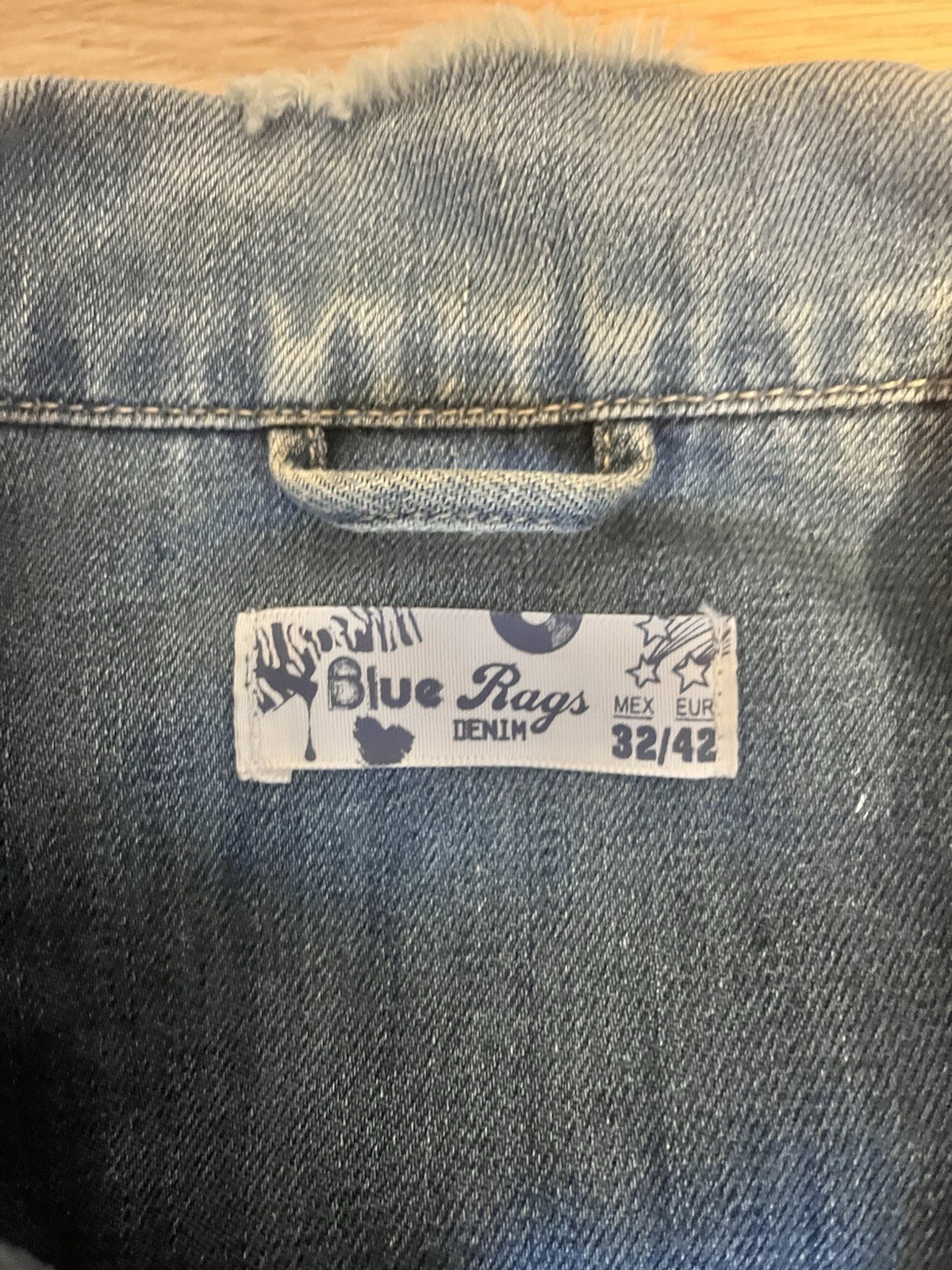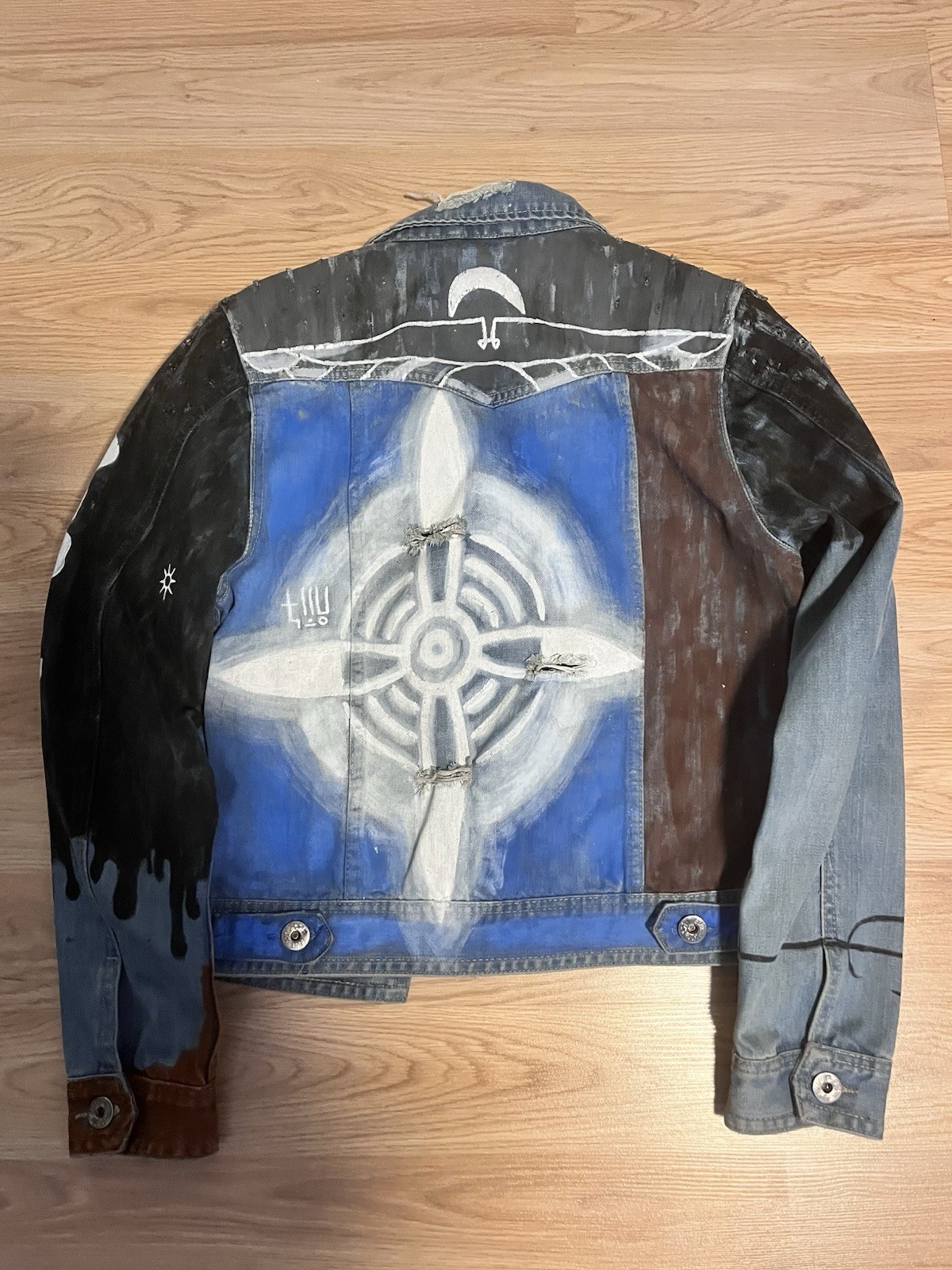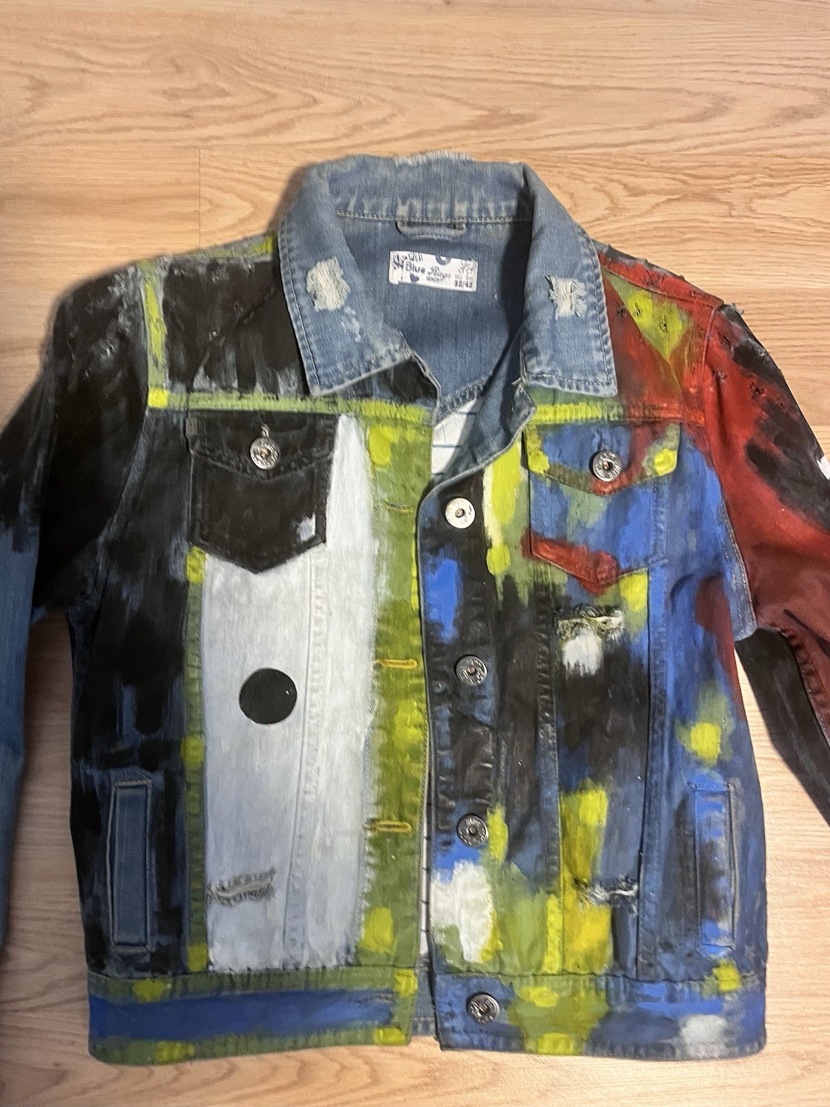 Denim Upcycled Jean Jacket is a small. Hand-painted and thrashed to give it a grunge look, this jacket is perfect for a casual occasion with its hip hop-inspired design. Made from denim material and originating from Sri Lanka, this Multi-Color jacket adds a touch of individuality to any outfit.