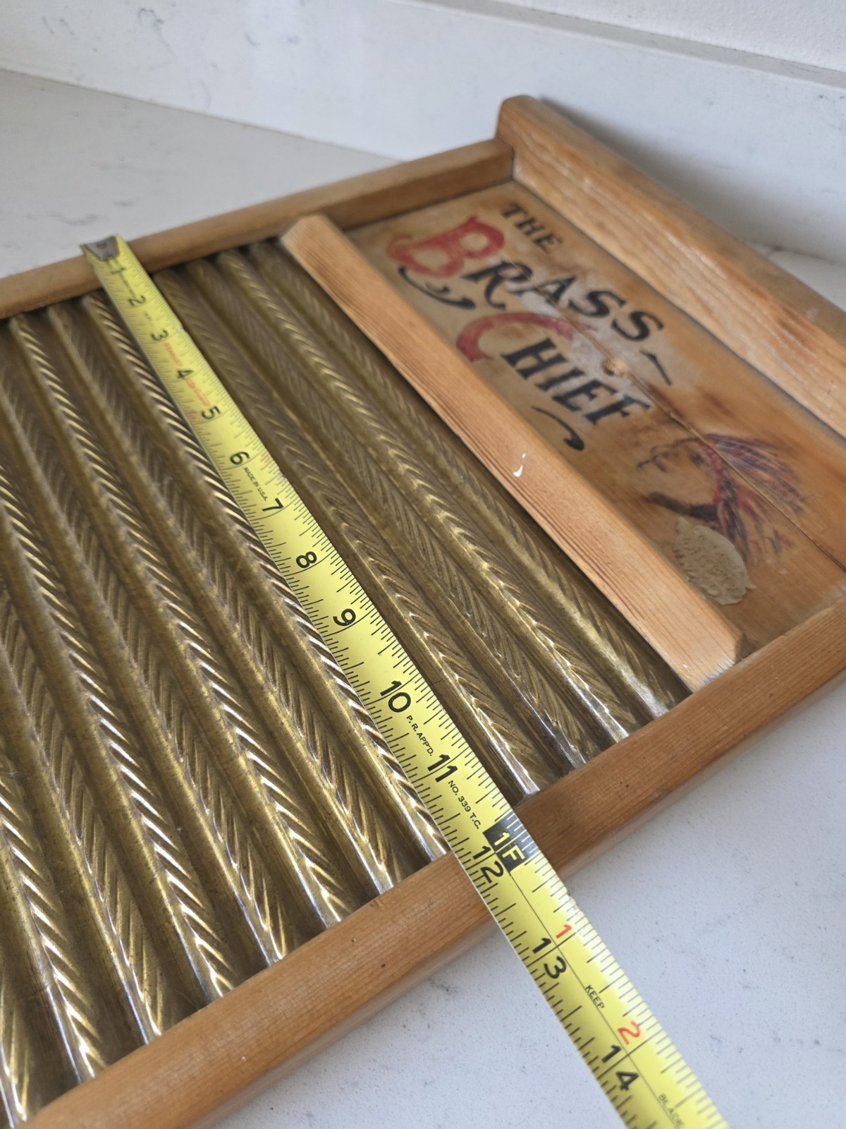 The product is an antique National Washboard Co. No. 430 Brass Chief made in the USA. This medium-sized washboard is crafted from metal and wood, featuring a tan/brown color and a primitive style. Originating from the US-Midwest, this vintage piece is a nostalgic touch of Americana with a touch of simplicity and charm.