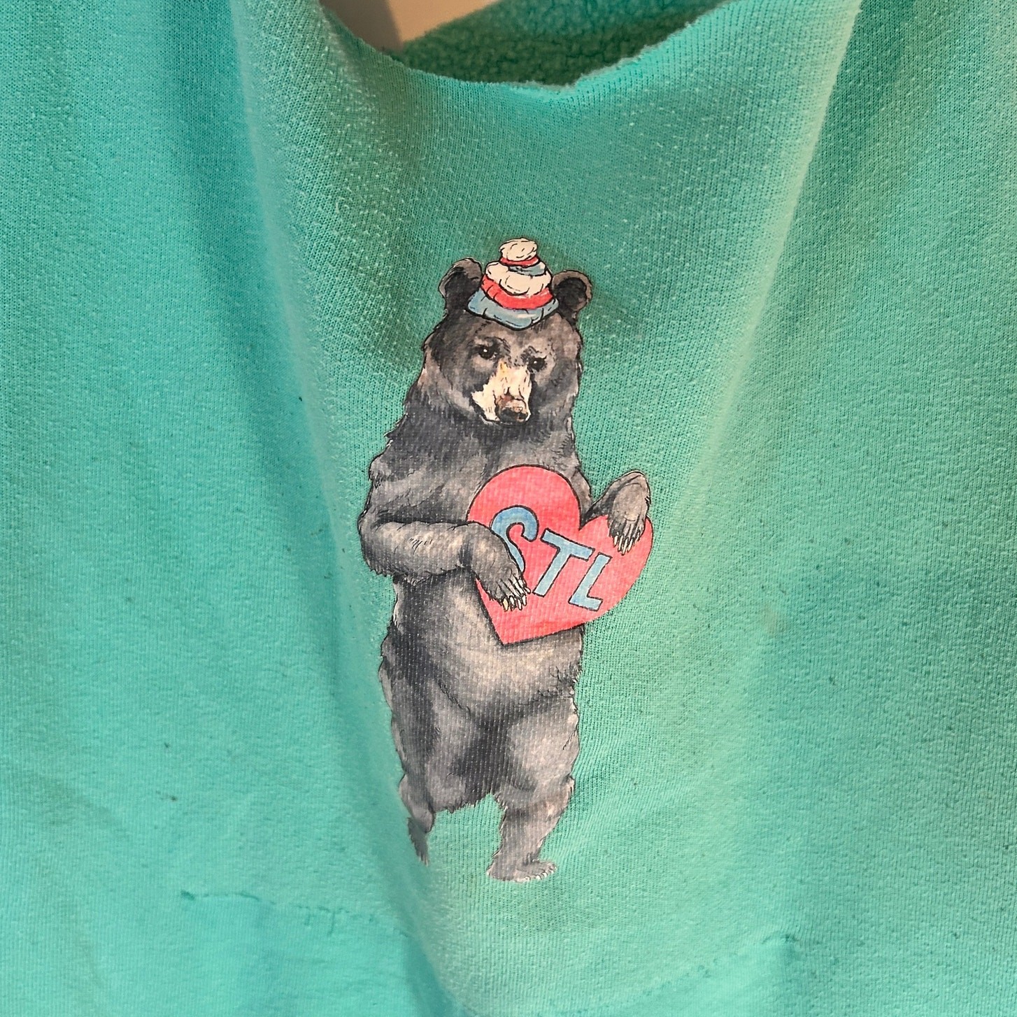 Handmade upcycled tote made from a vintage/older sweater (soft fleece feel) and repurposed into a roomy shopping bag. Features a cute bear holding an STL heart graphic and a fringe bottom. Lightweight, foldable, and perfect for groceries, farmers market, beach, or everyday errands.